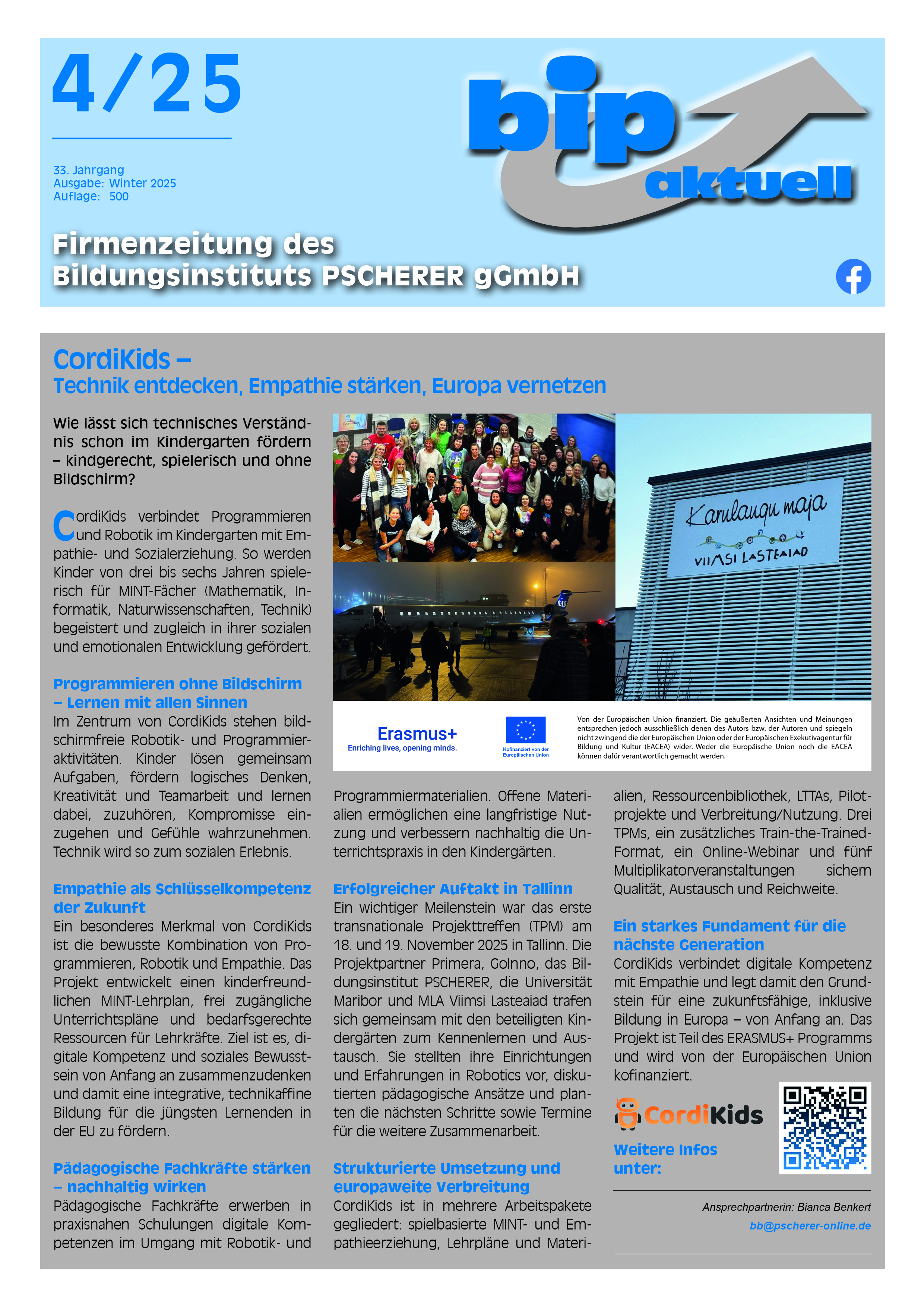 Passend zur winterlichen Jahreszeit ist die neue Winterausgabe unserer Firmenzeitung „bip aktuell“ erschienen. Auch diesmal haben wir für Sie wieder eine abwechslungsreiche Mischung aus aktuellen Informationen, Einblicken und Geschichten aus unserem Haus zusammengestellt. Freuen Sie sich auf Neuigkeiten und Angebote, spannende Einblicke in unsere Bildungsarbeit, interessante Projekte, die uns in den vergangenen Monaten begleitet haben, sowie auf Erfolgsgeschichten, die zeigen, was wir gemeinsam erreichen konnten.