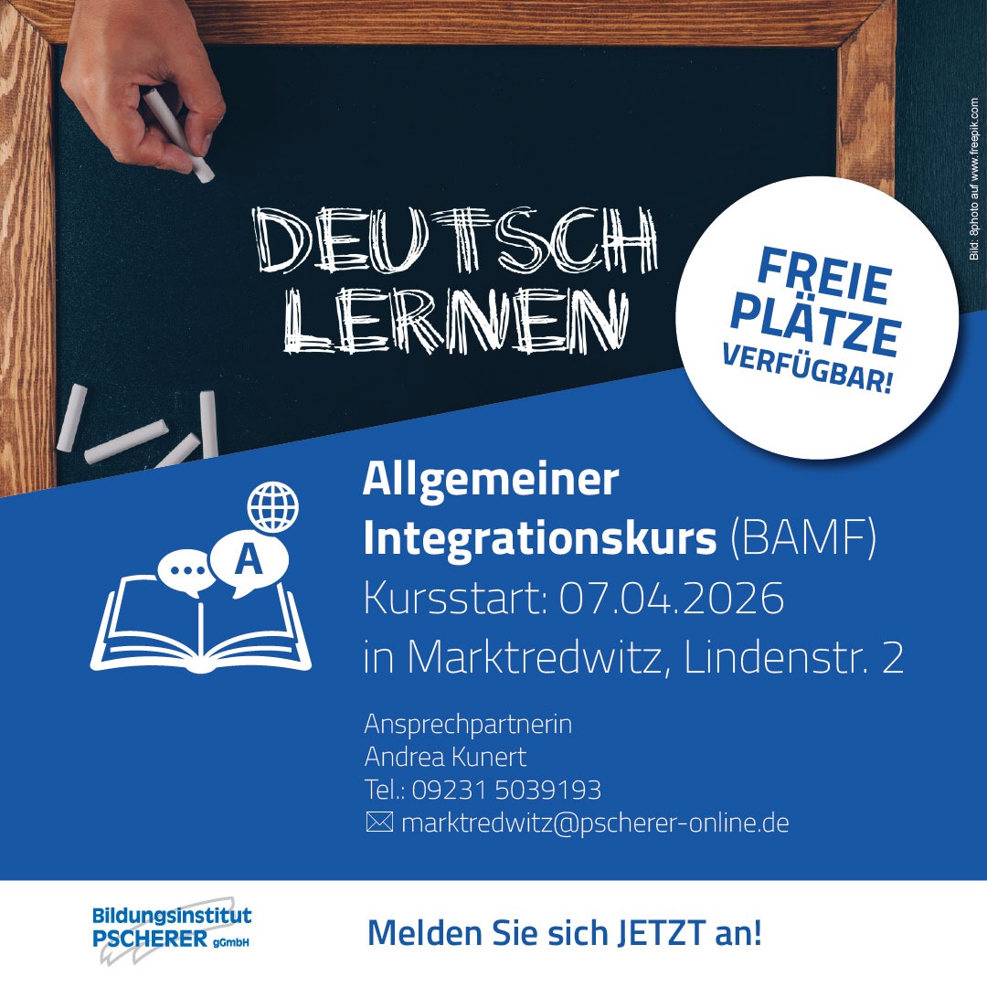 Sie möchten Deutsch lernen und sich in Deutschland besser integrieren? Unser allgemeiner Integrationskurs bietet Ihnen die perfekte Gelegenheit dazu – vormittags von 8:30 Uhr bis 11:45 Uhr beim Bildungsinstitut PSCHERER am Standort Marktredwitz.