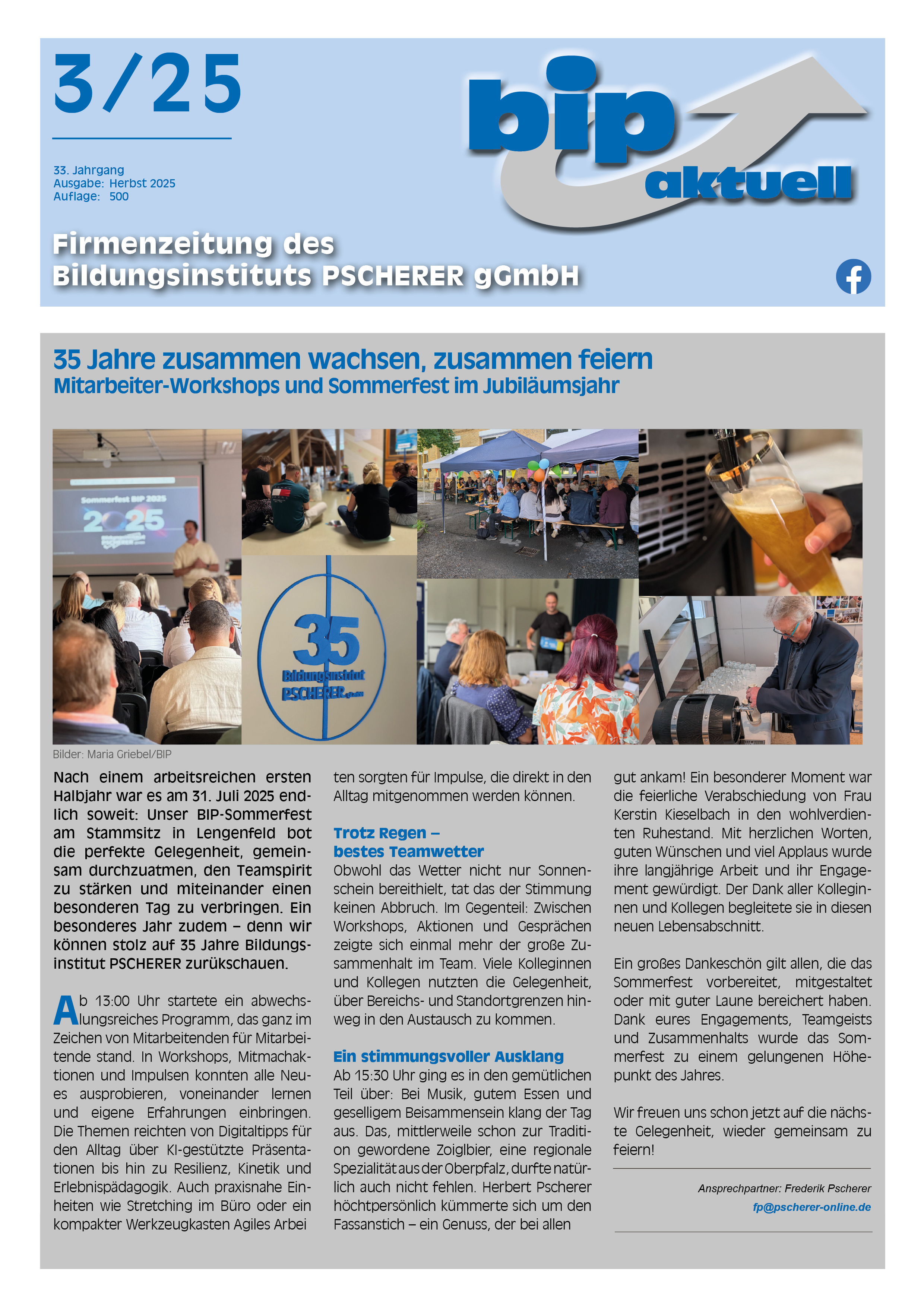 Die bip-aktuell ist konzipiert als Firmenzeitung des Bildungsinstituts PSCHERER. Sie erscheint quartalsweise und wird sowohl hausintern, als auch elektronisch verteilt. Die bip-aktuell wird von Mitarbeitern für Mitarbeiter und Interessierte zur umfassenden Information über das Unternehmen erstellt. Alle Mitarbeiter sind zur aktiven Mitarbeit und Berichterstattung über Aktivitäten im Bildungsinstitut PSCHERER aufgerufen.